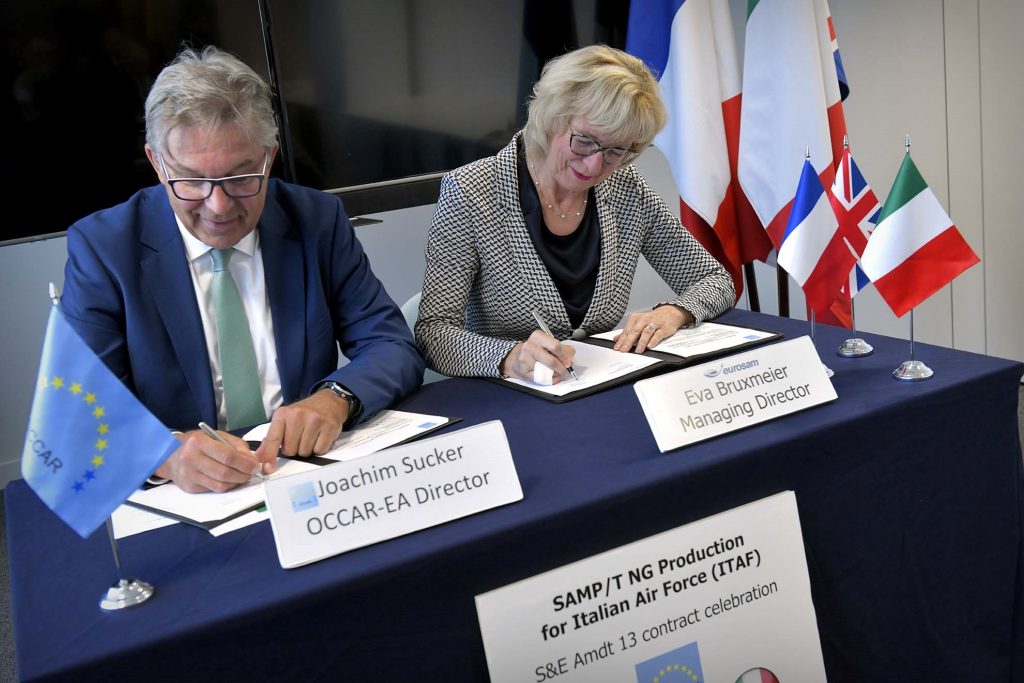 OCCAR-EA Director Mr Joachim Sucker and eurosam Managing Director Mrs Eva Bruxmeier signed Amendment 13 of the FSAF-PAAMS Sustainment & Enhancement (S&E) contract for approximately 700 million euro for the procurement of the new generation of ground medium-range air defence systems SAMP/T NG for the Italian Air Force. This procurement adds to the SAMP/T NG production ordered in January 2023 for the Italian Army and French Air & Space Force.