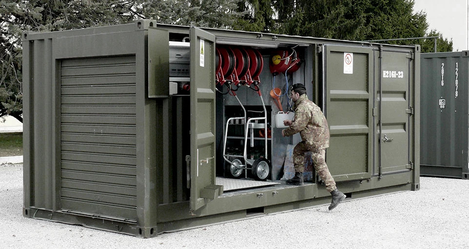 OMP Engineering manufactures completely autonomous modules for the storage and distribution of lubricants. These systems can be equipped with a generator set for autonomous operation, electrical panel and distribution circuit, air compressor with dedicated distribution line, air conditioner, machinery, tools, storage cabinets and shelves and pumps for grease distribution. The company from Dueville (VI) has been operating since 1959 and manufactures a range of products ranging from water treatment to fuel storage and distribution, from field structures to medical and biocontainment facilities.